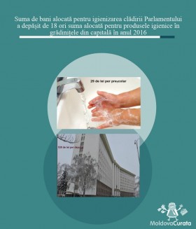 De mai mulți ani, grădinițele din capitală nu sunt asigurate cu săpun lichid suficient și nici cu hârtie igienică. Autoritățile publice locale motivează prin faptul că nu sunt bani suficienți pentru aceste produse. De regulă, sunt alocate mijloace financiare doar pentru detergenți, var, clor, iar igiena copiilor este lăsată în grija părinților. În schimb, pentru aleșii poporului statul alocă resurse din belșug pentru produse igienice de calitate. Bunăoară, dacă anul trecut din bugetul public au fost alocați doar 29 de lei pentru procurarea produselor igienice de uz casnic pentru un copil, atunci pentru un angajat din clădirea Parlamentului au fost cheltuiți tocmai 530 de lei, adică de 18 ori mai mult decât se alocă pentru un copil care frecventează grădinița în capitală.