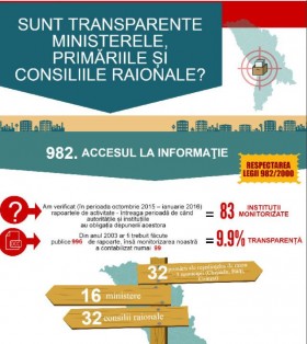 Moldova Curată vă arată cum au fost respectate principalele prevederi ale legilor Legii privind accesul la informaţie nr. 982/2000 şi ale Legii privind transparenţa în procesul decisional nr. 239/2008 de la promulgare până în prezent cu ajutorul unui videografic realizat în cadrul proiectului “Podul Bunei Guvernări”.