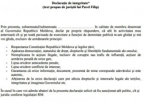 Declaraţiile de integritate semnate de către premierul Pavel Filip şi actualii miniştri stârnesc controverse. Chiar dacă au fost plasate pe pagina web a Guvernului, veridicitatea declaraţiilor este pusă la îndoială de către societatea civilă, atât timp cât acestea au fost semnate în taină. O altă situaţie este peste Prut. Deşi nu au fost semnate în public de către membrii Guvernului Cioloş, declaraţiile de integritate au fost stocate de către societatea civilă, iar presa are grijă să supravegheze ca demnitarii să respecte criteriile de integritate asumate la început de mandat.