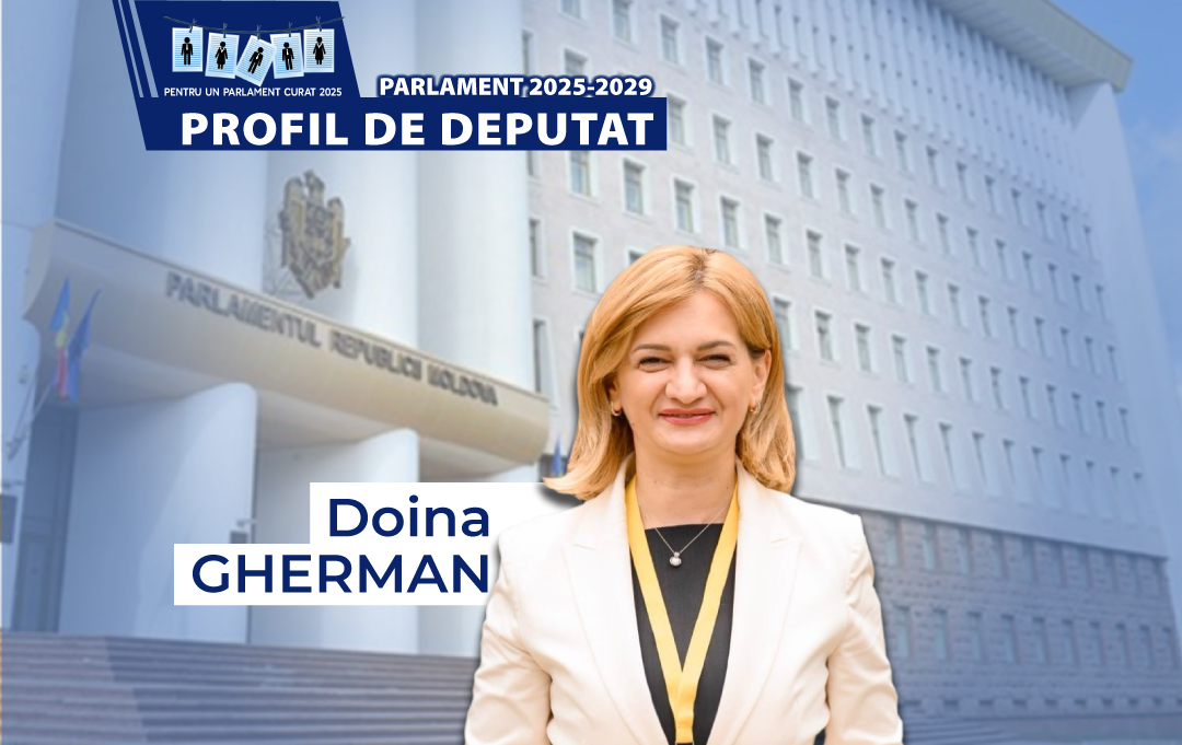 Doina Gherman (43 de ani) este deputată în fracțiunea Partidului Acțiune și Solidaritate (PAS) și vicepreședintă a Parlamentului. Născută în Chișinău, studiile medii de specialitate le-a făcut la Colegiul Pedagogic „Ion Creangă”, între 1998 - 2001. Este licențiată în Limbi și Literaturi Străine la Universitatea de Stat „Alecu Russo”, unde a învățat între 2001 și 2005. Are un master în Management la Academia de Administrare Publică, acolo unde a studiat între 2011 și 2014.