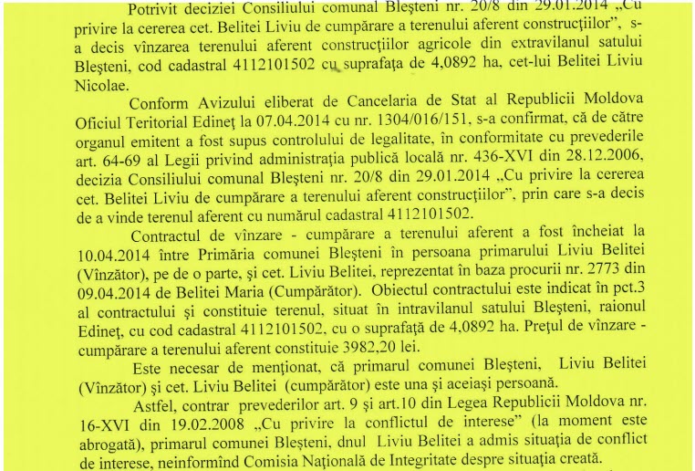 Primarul comunei Bleșteni din raionul Edineț, Liviu Belitei, a încheiat un contract cu sine însuși, prin care și-a vândut un teren de peste 4 hectare. Documentul este semnat de Liviu Belitei în calitate de primar și de soția sa, care l-a reprezentat, prin procură, pe cumpărătorul Liviu Belitei. Tranzacția s-a făcut acum 6 ani, însă despre ea s-a aflat abia acum. Primarul nu a anunțat, așa cum era necesar, Comisia Națională de Integritate (CNI) și nici nu a indicat în declarațiile de interese personale acest fapt. Întrucât termenul până la care alesul local putea fi sancționat a expirat, ce se mai poate face este anularea contractului, prin intermediul instanțelor de judecată, ne-a explicat experta anticorupție Mariana Kalughin.