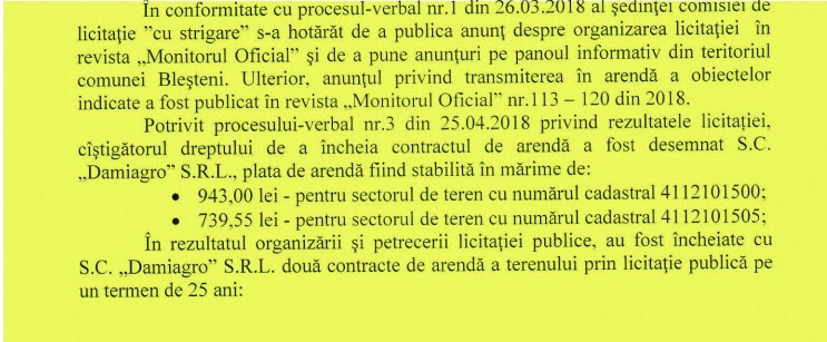Inspectorii financiari au mai constatat că în perioada 2017-2020, Primăria Bleșteni a încheiat două contracte de arendă cu firma S.C „Damiagro SRL”, administrată de fiica primarului, Daniela Loziuc. Menționăm că firma Damiagro SRL a fost fondată în anul 2005 de către Liviu Belitei și este specializată în domeniul agriculturii. Doar că acele două contracte au fost semnate de viceprimarul Veaceslav Evstratii, în aceeași zi - 14 decembrie 2018. Suma totală pentru arendarea celor două loturi este de circa 1680 de lei. În luna aprilie a aceluiași an, firma fondată de primar a procurat și un teren agricol de circa 2 hectare cu suma de peste 32 de mii de lei.